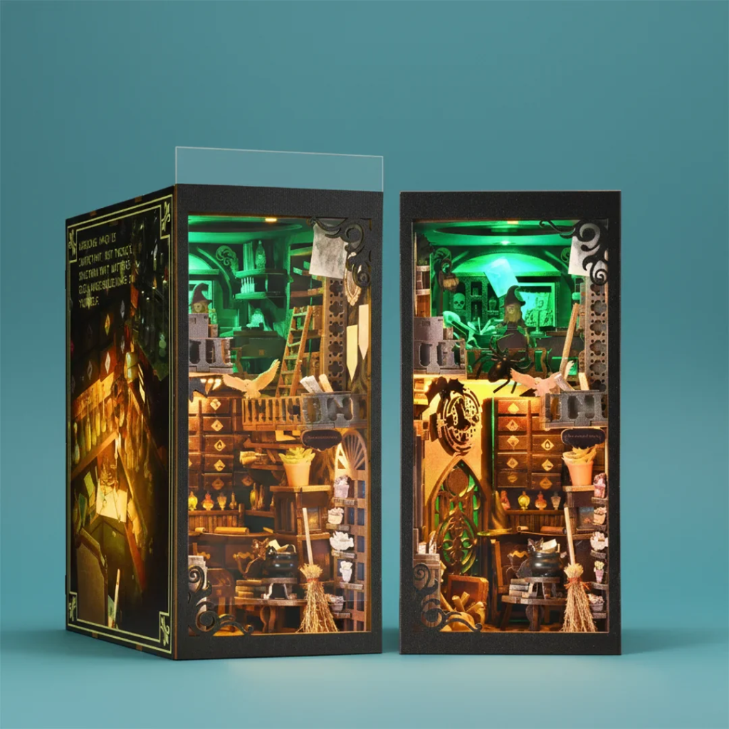 Een Book Nook is een miniatuur bouwpakketje dat u, als het af is, tussen uw boeken in de boekenkast plaatst. Het is als een klein kijkdoosje voor volwassenen. Denk aan een miniatuur straatje uit Parijs, een ouderwetse bibliotheek of een Japanse tuin, maar dan verlicht en vol details. U zet het houten pakket zelf in elkaar, lijmt de onderdelen en creëert zo een magisch ’tussenstukje’ in uw boekenkast.